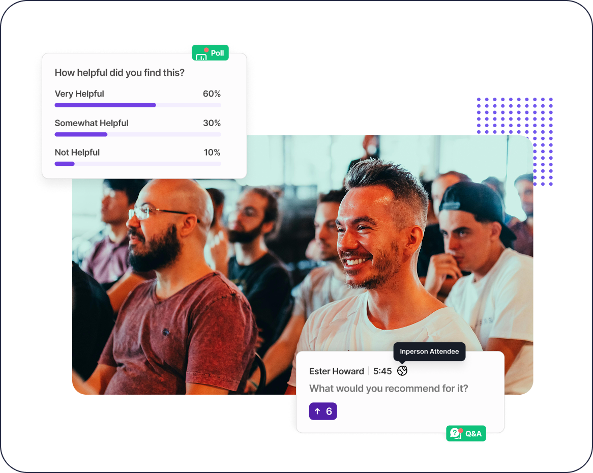 With built-in tools like live Q&As, instant polls, and networking opportunities, Townhall keeps attendees engaged throughout the length of your events. You can easily drive conversations and connect people, no matter where they are.