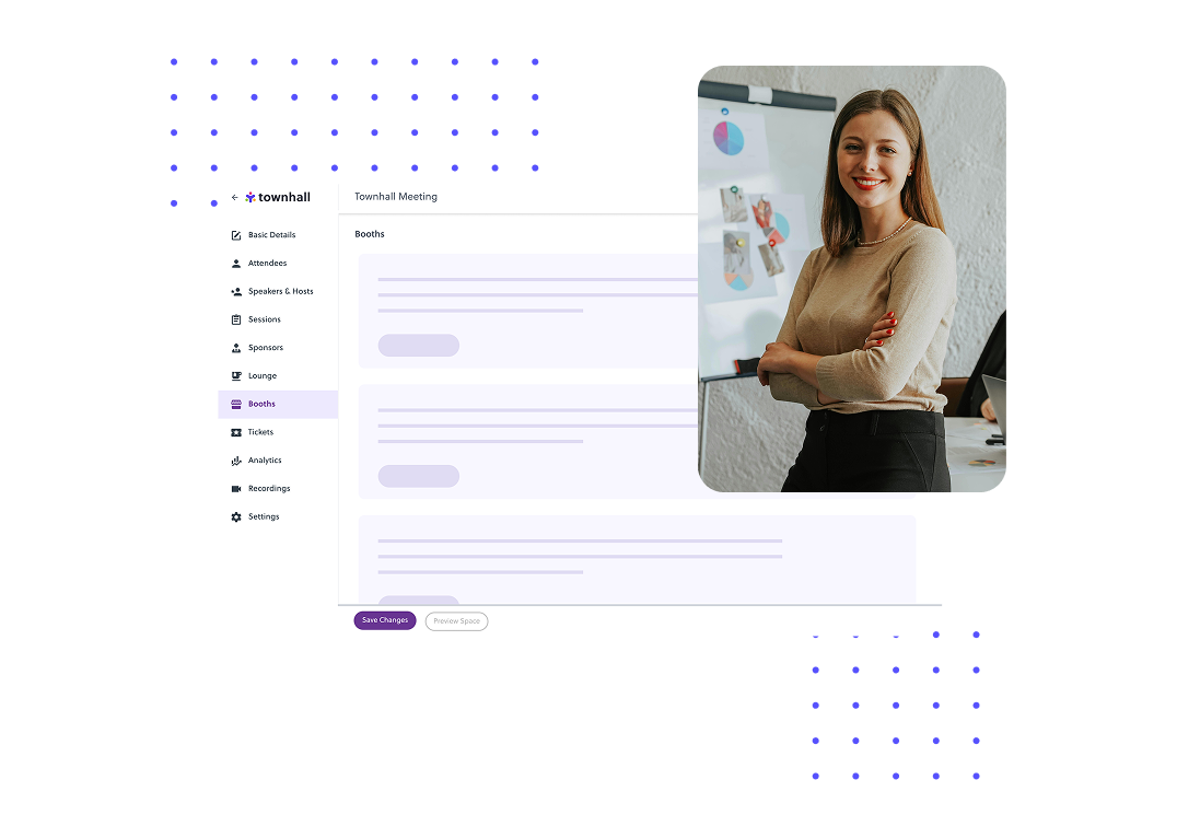 Take control of your event with Townhall’s powerful admin console. Seamlessly manage registrations, agenda, sponsors, booths, dynamic updates and attendee engagement from one intuitive interface. Ensure a smooth and stress-free event planning and execution.