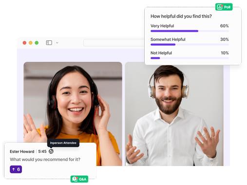 Enable live audience interaction with moderated Q&A, reactions, and structured polls. Moderators can highlight key questions for panelists, and control chat visibility settings to maintain a professional discussion environment. Poll responses can be displayed in real-time, providing instant audience sentiment analysis.