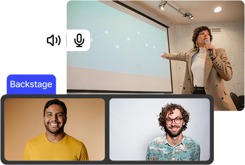 Speakers and panelists prepare in a backstage environment before going live. Organizers can test audio/video, conduct pre-session briefings, and queue speakers seamlessly. Transition controls ensure a smooth switch between presentations, minimizing technical disruptions.